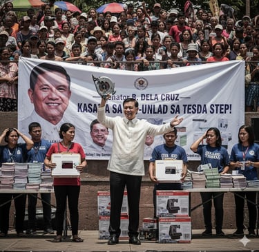 Steal the Credit: The politician stands before the jubilant, cash-in-hand beneficiaries, casting the illusion that the $\text{PHP60.00}$ daily allowance and the invaluable toolkit are personal gifts from their political coffers, rather than a non-negotiable right funded by the national treasury.